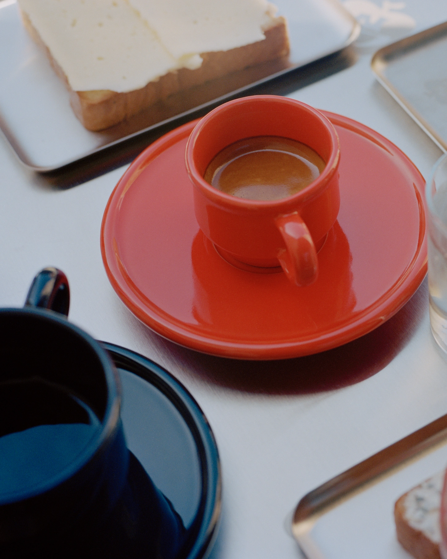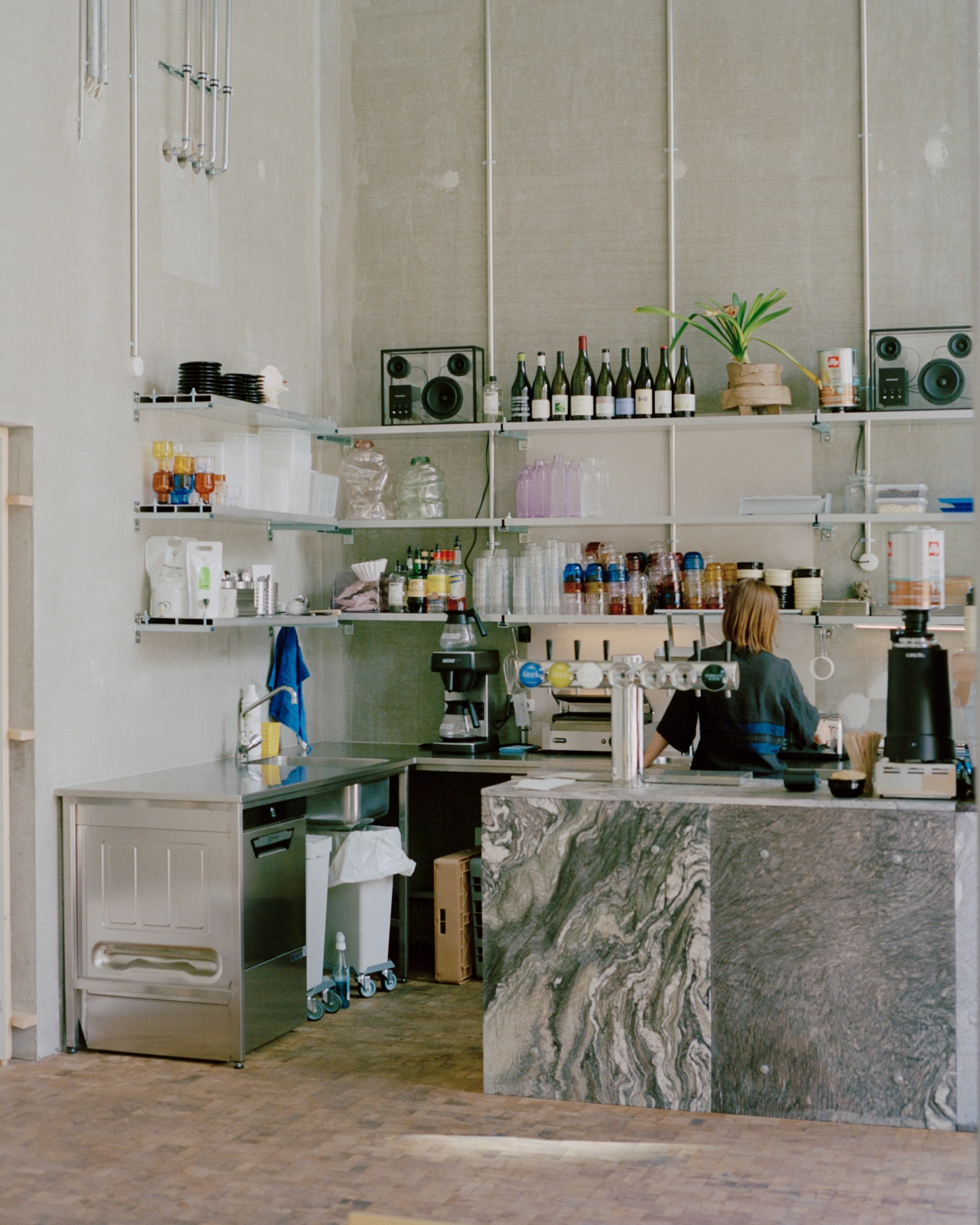 From the street, it looks more like a workshop than a café; a low room of glass and steel, where the water outside reflects softly against the concrete floor. Inside, there is an immediate sense of order without rigidity. The furniture sits with intent, not decoration. Tables are set at a generous distance, the surfaces brushed and slightly cool to the touch. Nothing here feels newly unwrapped. You sense that everything has been handled before — the mugs with their uneven glaze, the chairs that mark slightly under pressure, the counter that absorbs light rather than bouncing it back.