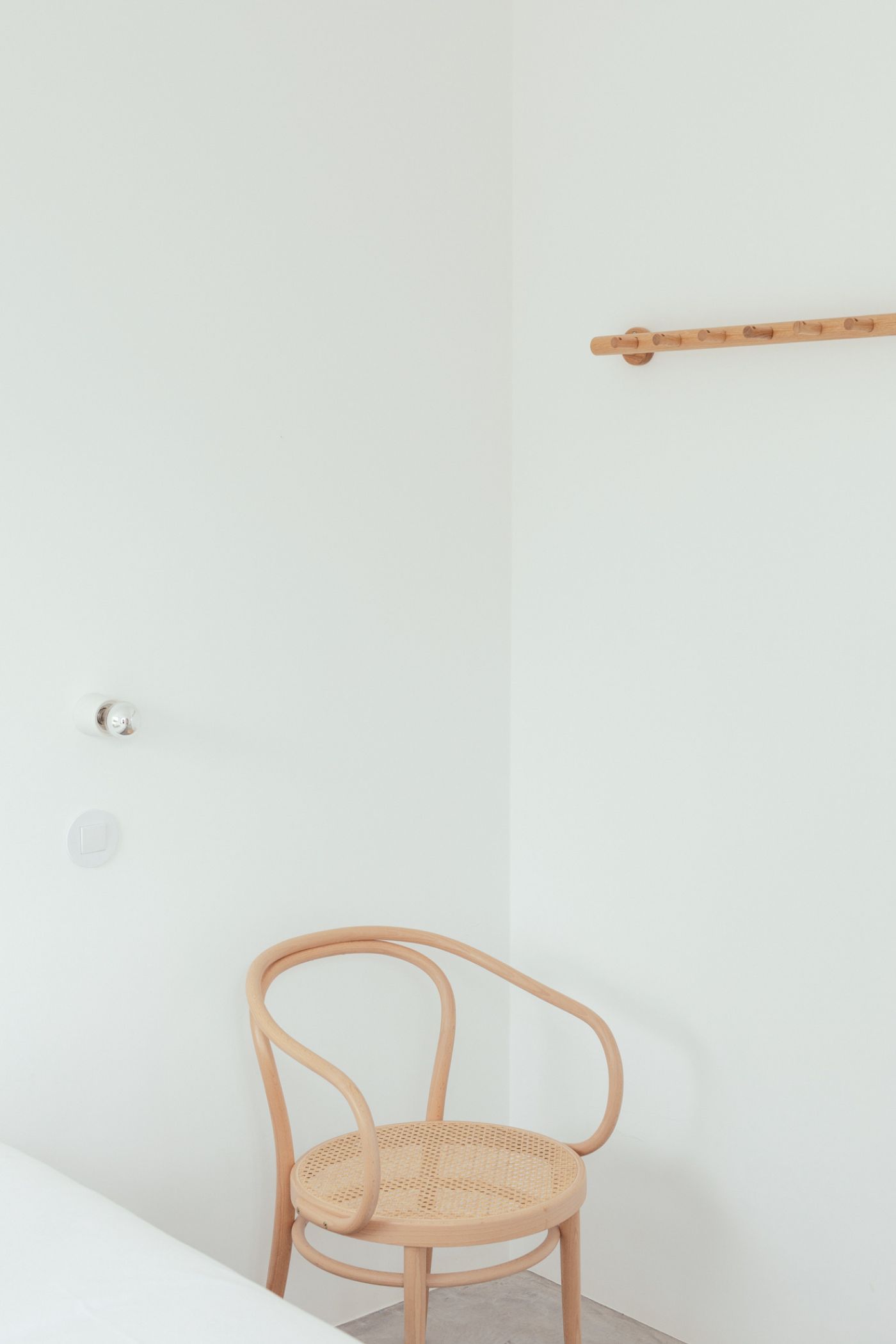 White walls and concrete floors dominate the interior of the house. They provide an elegant backdrop for the carefully selected design objects and furniture by Studio Stories (the creative team responsible for the interior design). They were harmoniously combined with old wooden furniture, which brings to mind the original character of the home. An additional finishing material that lends an authentic character to the interiors is stone. The locally sourced ‘Brecha de Tavira’ stone is used in bathrooms as wall and floor coverings, as well as in custom-made sinks and the kitchen countertop. In the living room guests consume the meals around a massive table fashioned from gigantic slabs of travertine, turning this piece of furniture into a work of art.