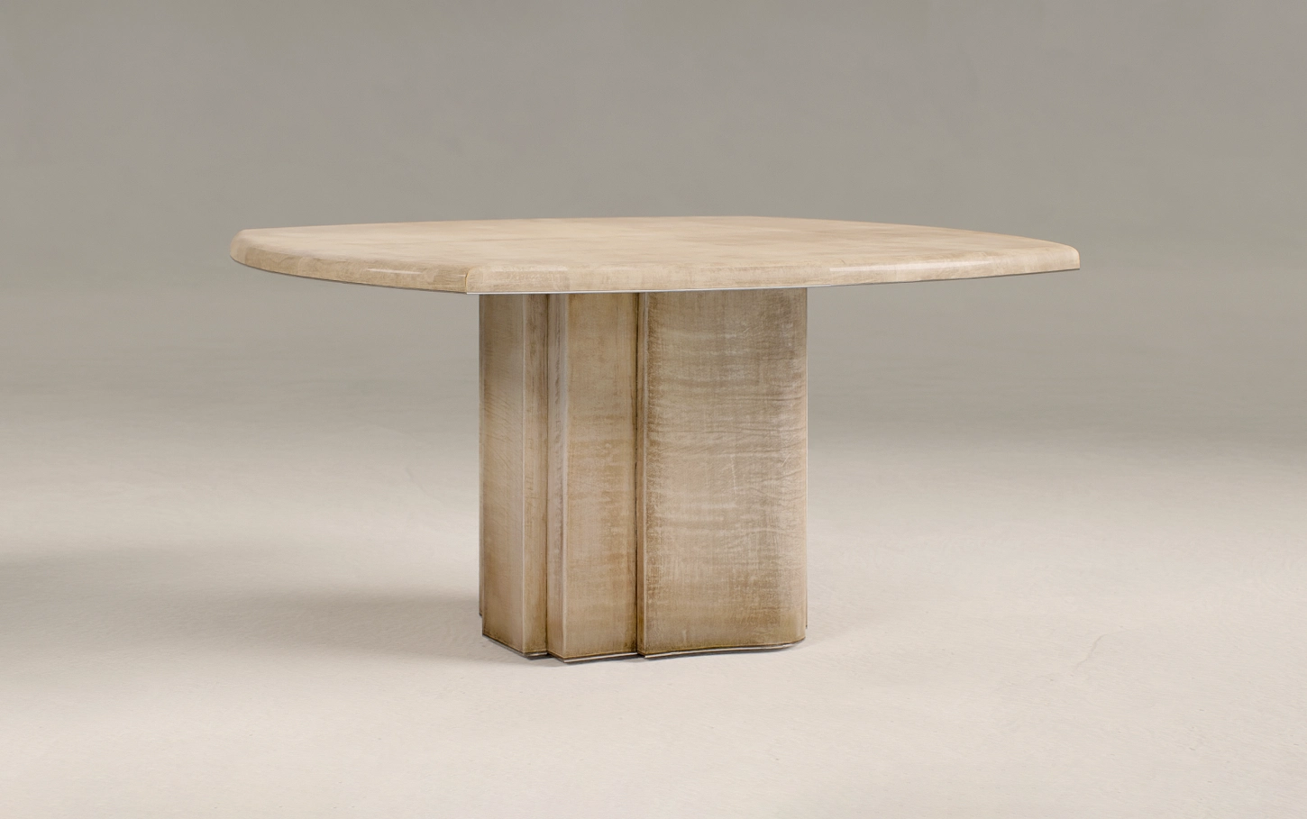 The collection consists of tables, chairs, wall pieces, benches, and other functional forms. Their construction is reduced to essential gestures: planes meeting at quiet angles, surfaces shifting from taut to loose, weight balanced with care. The silhouettes are irregular but deliberate, avoiding any sense of symmetry for its own sake.