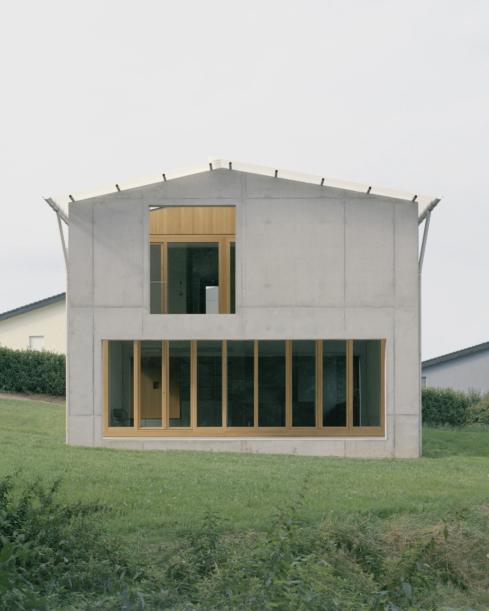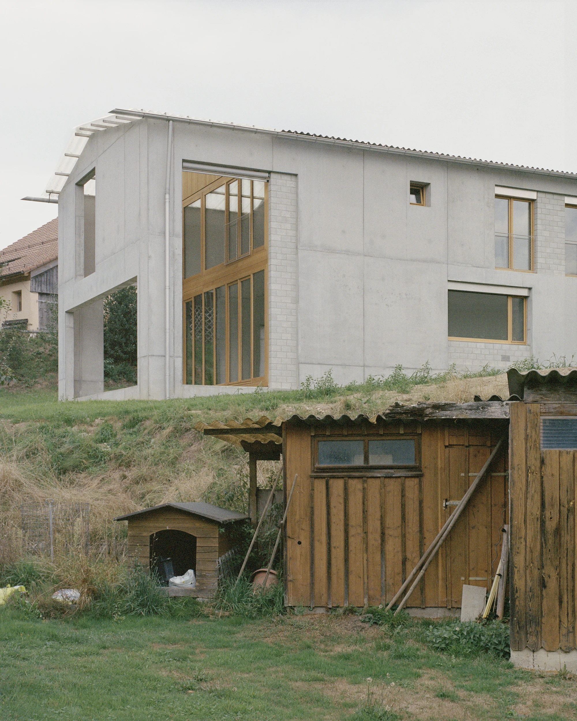 The first thing you see is a concrete wall, and it tells you nothing. No window, no door, no indication of what lies behind it. This is deliberate. Deschenaux Architectes has designed a house in Vuissens — a secluded village in the canton of Fribourg that still feels genuinely rural — that requires you to walk around the wall, notice a strip of light behind the dark garage, and discover your own way in. It is architecture that withholds welcome just long enough to make the interior feel earned.