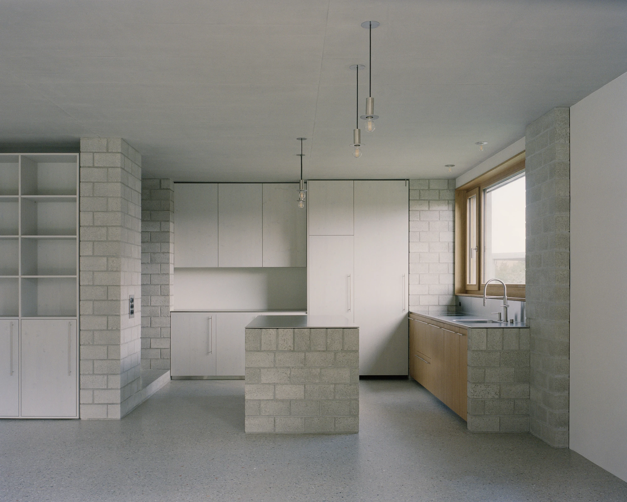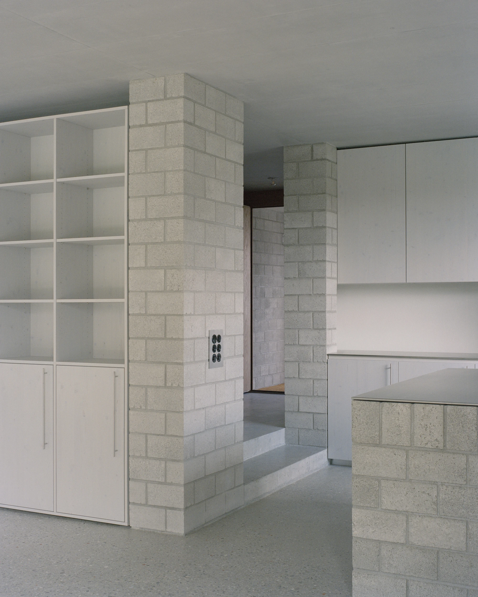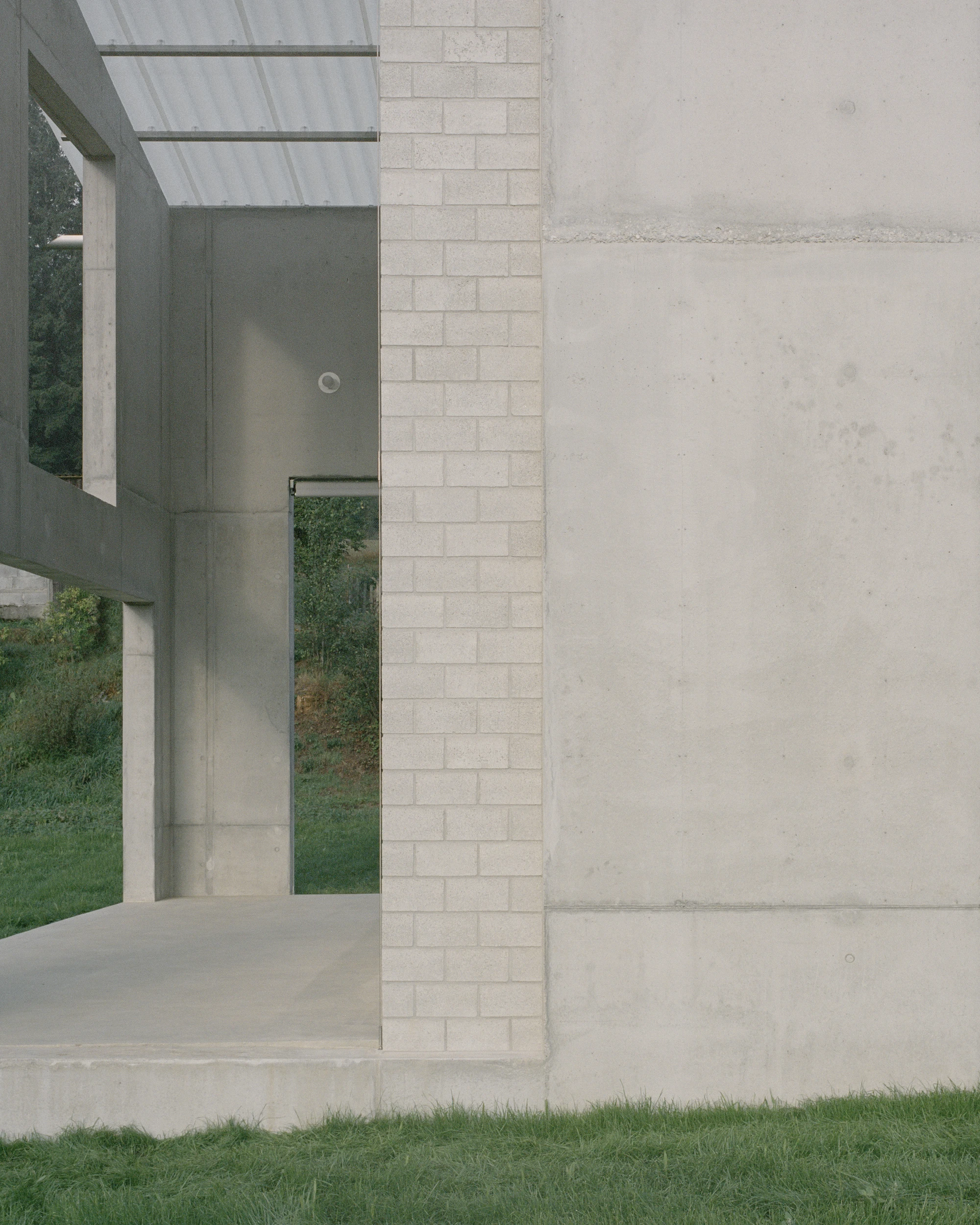 The design language borrows not from architectural magazines but from the rural surroundings: brick storage buildings, simple metal-roofed henhouses, the pragmatic logic of structures built to work rather than to impress. Concrete envelops both heated and outdoor spaces. Cement bricks define the insulated volume. Mineral insulation goes on in a single layer with no vapour barrier needed. The ground-floor slab serves as flooring, heating system, and structure simultaneously. Nothing is redundant.