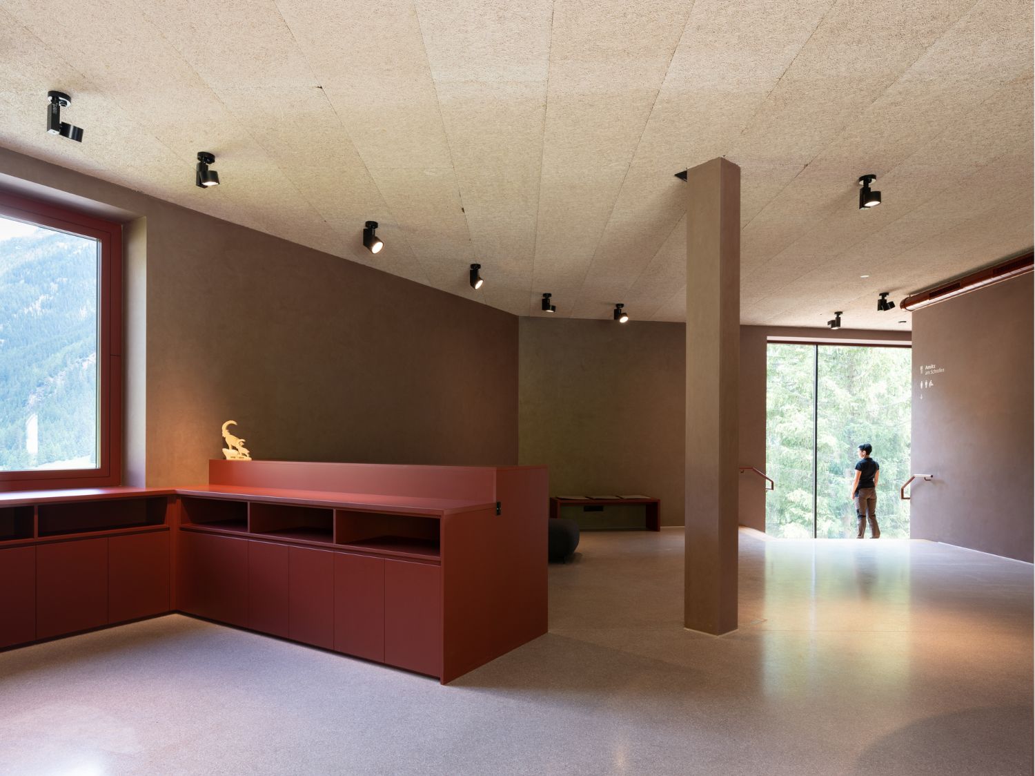 The indoor exhibition is completed with an outdoor enclosure for seven ibexes. Upon a wooded mountainside, you see a reddish building, somehow appearing like a small castle. It is the Ibexmuseum St.Leonhard. Right next to one of the oldest farmhouses of the valley, with nearly the same footprint of the old barn which was standing there, a towerlike building has been constructed in precast concrete, where the lower parts are quoting the wooden surface of the barn.