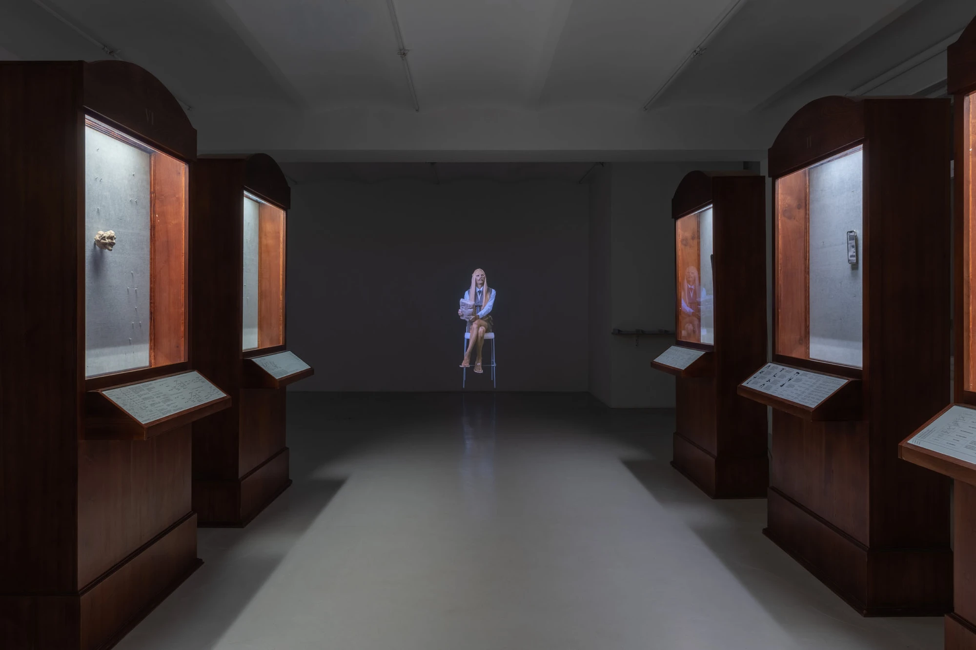 The exhibition unfolds across media, each a vessel for the character's particular wit and critique. Created in collaboration with costume designer Leila El Alaoui, Ötza occupies the gallery through sculptural presences—amber-lit wooden cabinets arranged with theatrical precision—that function as both archive and stage set. They suggest storage, containment, the institutional logic that seeks to pin down meaning. But Ötza resists pinning. Her fan fiction pieces, in which Carrie, Miranda, and Charlotte meet semantics, and a post-Marxist, posthumanist revolt takes on a mute form in a yogic silent retreat, operate as both comedy and critique.