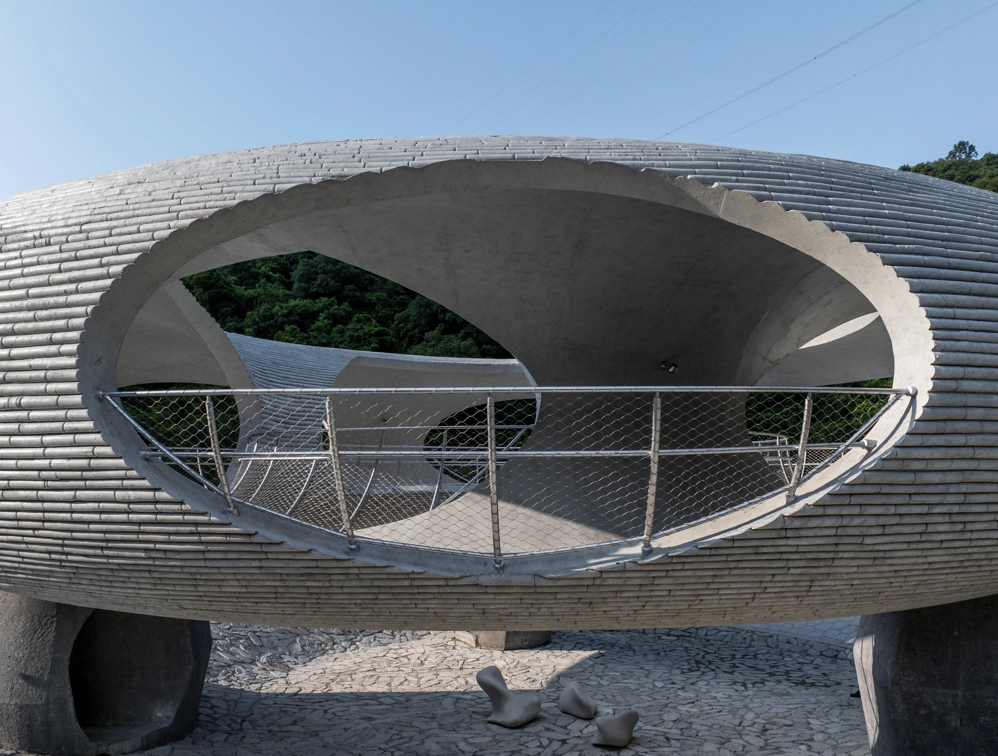 It looks, from the air, like a concrete donut that landed on a mountainside and decided to stay. Sixteen metres in diameter, porous and hovering above a stone platform between highway and river, HCCH Studio’s Resting Loop with Views occupies a site that was previously a parking area at a sharp bend in the road on Mount Luofu. The functional brief — rest stop and vista point for cyclists, with services for parking and beverages — could have produced a shed. Instead it produced something closer to a small observatory for landscape itself.