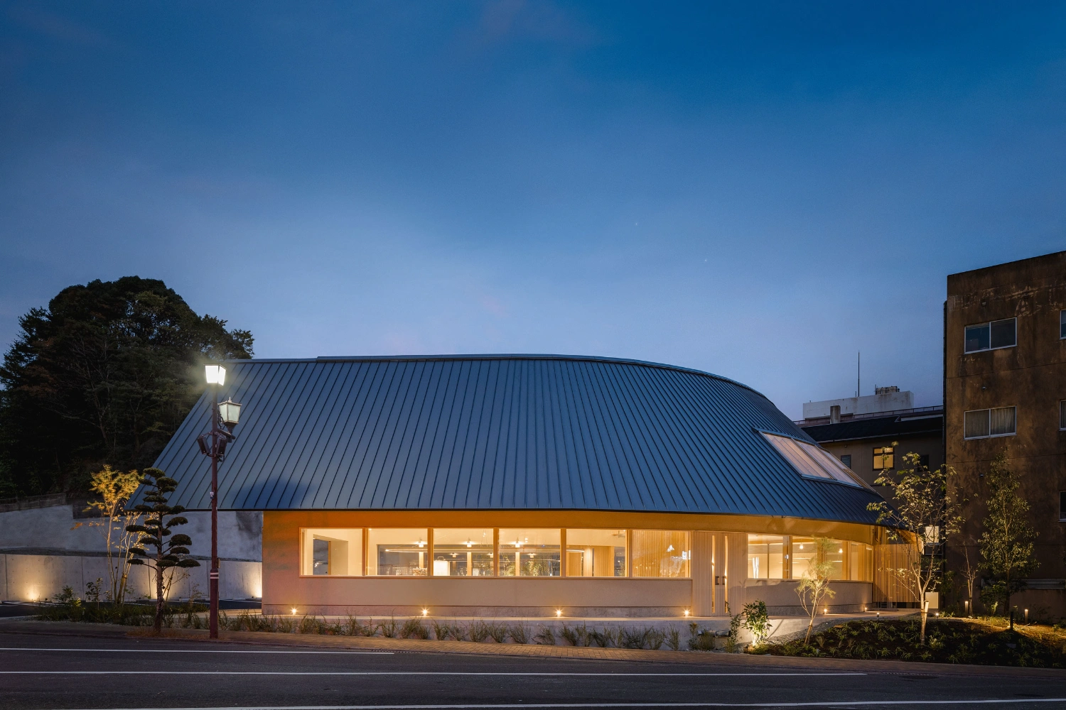 The project begins with a bold choice: to resemble a vernacular wooden house with a softly arched exterior that dialogues with the adjacent gate. That curvature, far from being merely aesthetic, frames a new threshold — a semi‑public courtyard that draws visitors inward. Within this sheltered court lies a foot bath fed by hot spring water: an invitation to linger, to slow, and to sediment one’s experience of place through body and time.