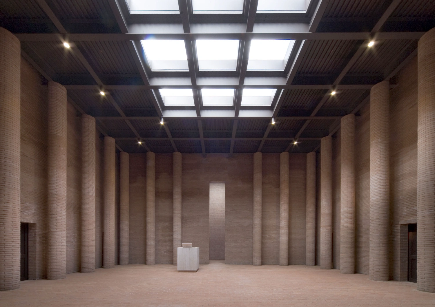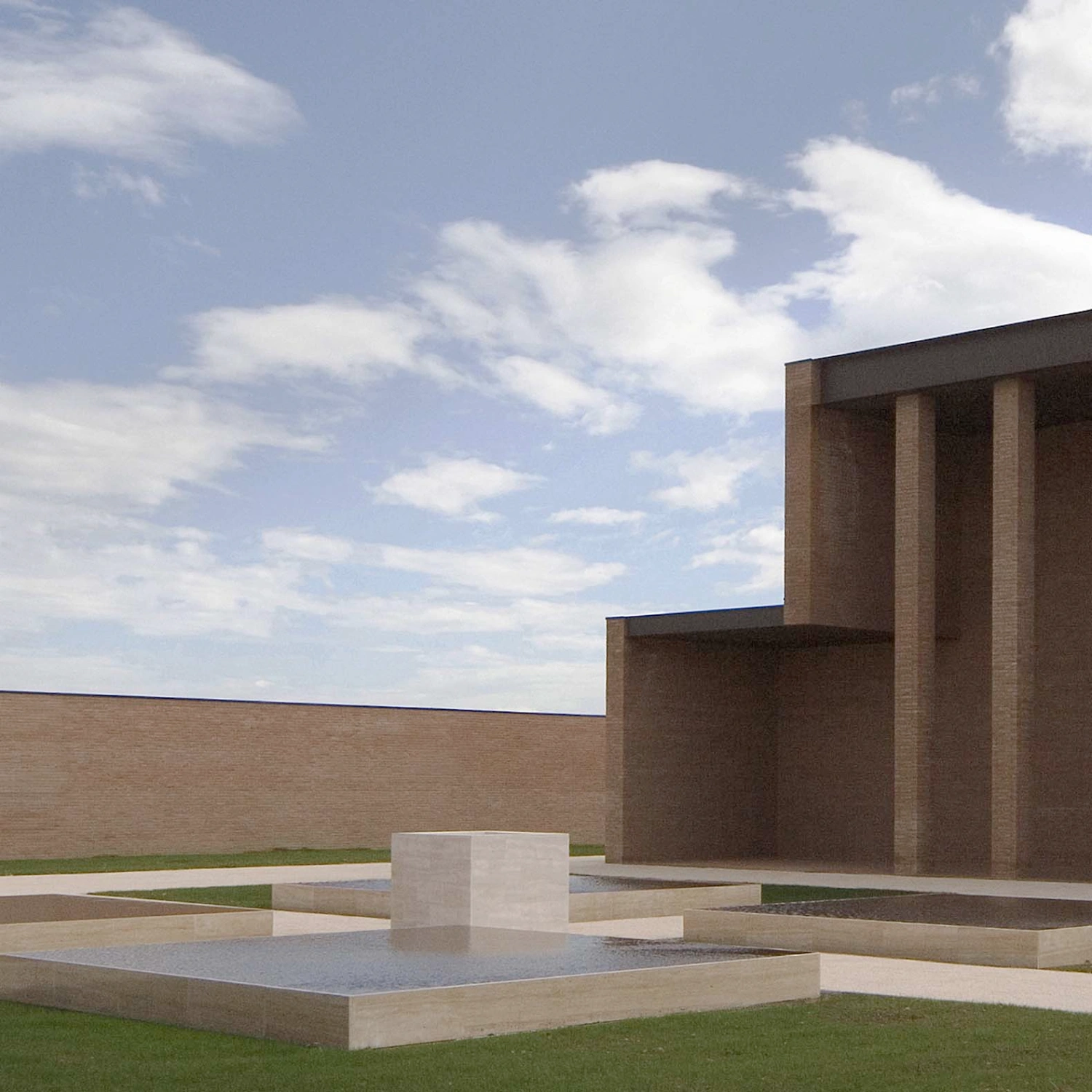 At the core, the Temple rises as an elevated, basilica-like volume—a fragment more than a building, as though cut from a larger, lost whole. Its stepped brick masses extend east and west like wings, addressing both Parma and Valera with equal gravity. From afar, it registers as an urban signal: not monumental in the classical sense, but steadfast, a horizon-latched marker of collective memory. The exterior courts, articulated by sheets of water and clipped lawns, intensify this stillness. Their precise, planar geometries stage the sky as a participant in the ritual, a luminous counterpoint to the weight of masonry.