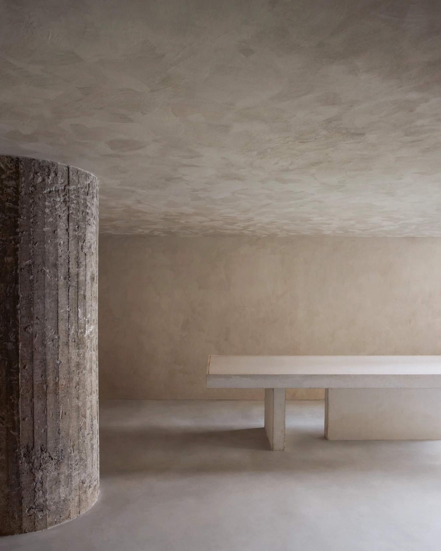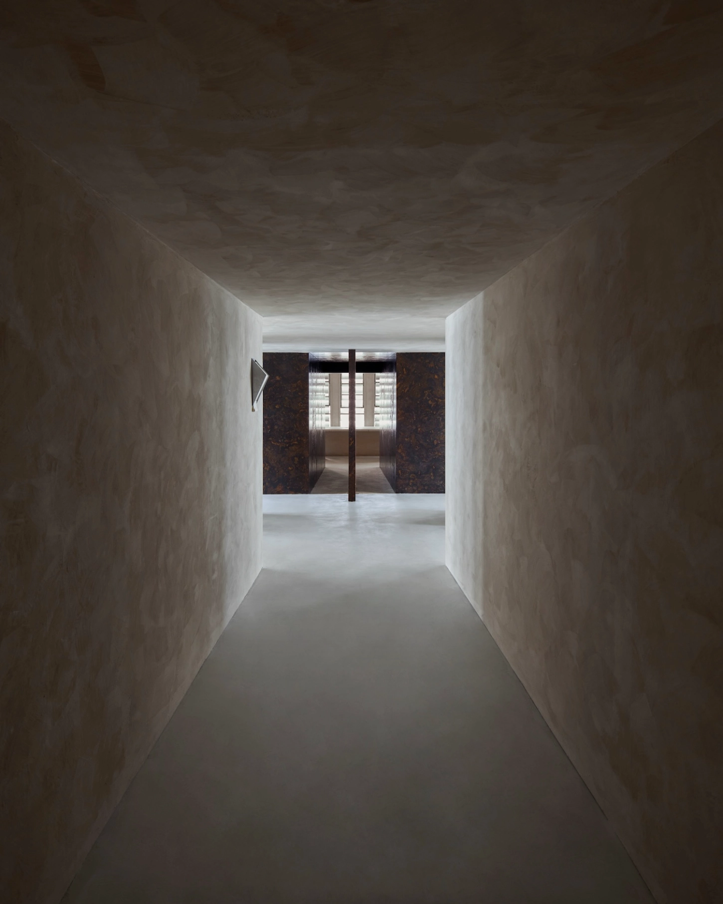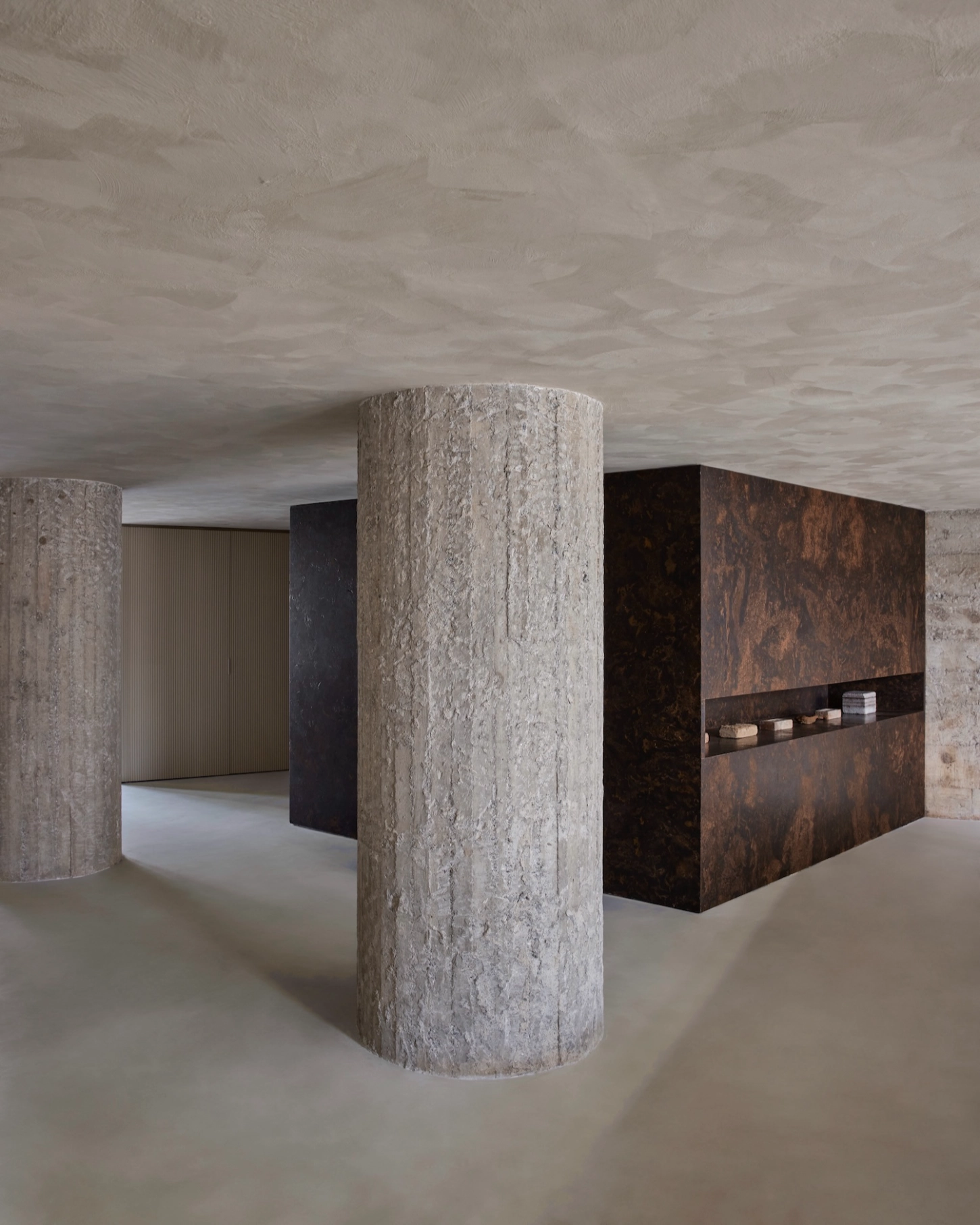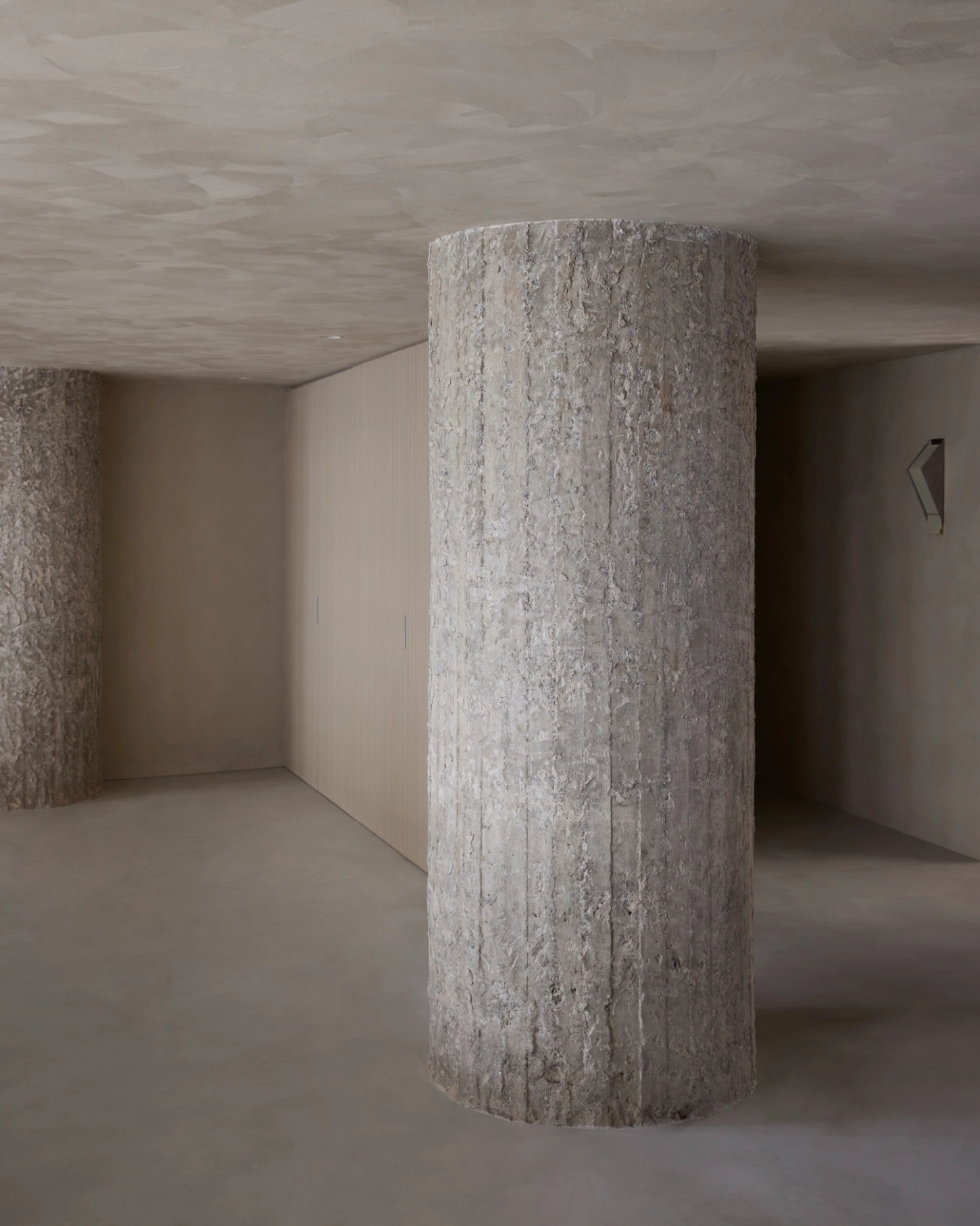 The existing concrete remains exposed, carrying visible traces of time and construction. This structural honesty establishes continuity with the building’s original modernist logic, allowing the new program to sit within a clear historical framework. Against this neutral base, volumes clad in Radica stone introduce density and define circulation. Their weight and texture contrast the concrete, grounding movement through the space and marking areas of more intimate occupation. Lime-coated walls and ceilings diffuse daylight evenly, producing soft luminosity without decorative additions.