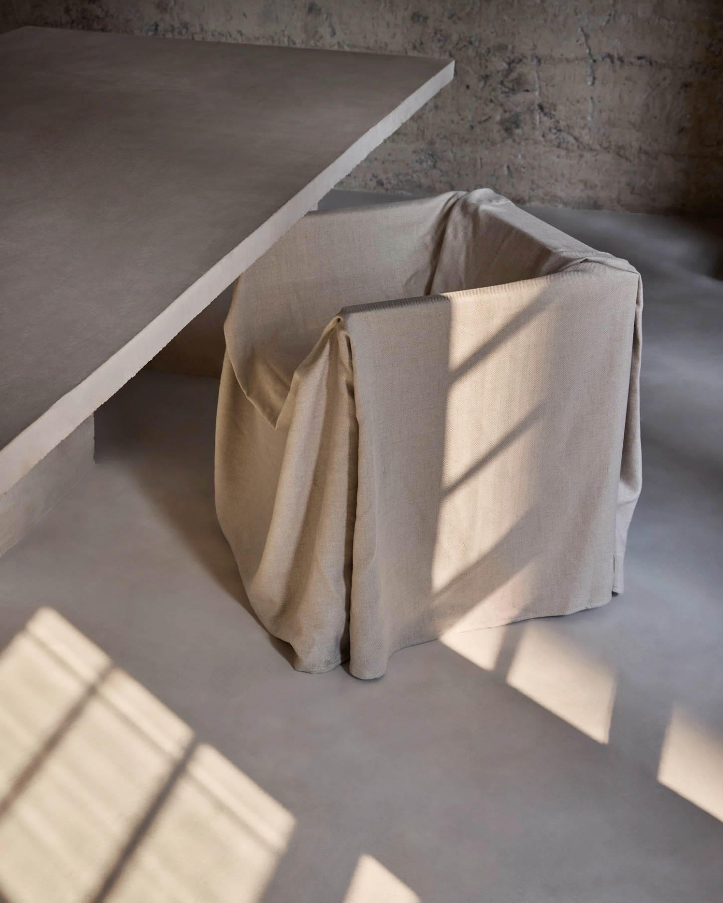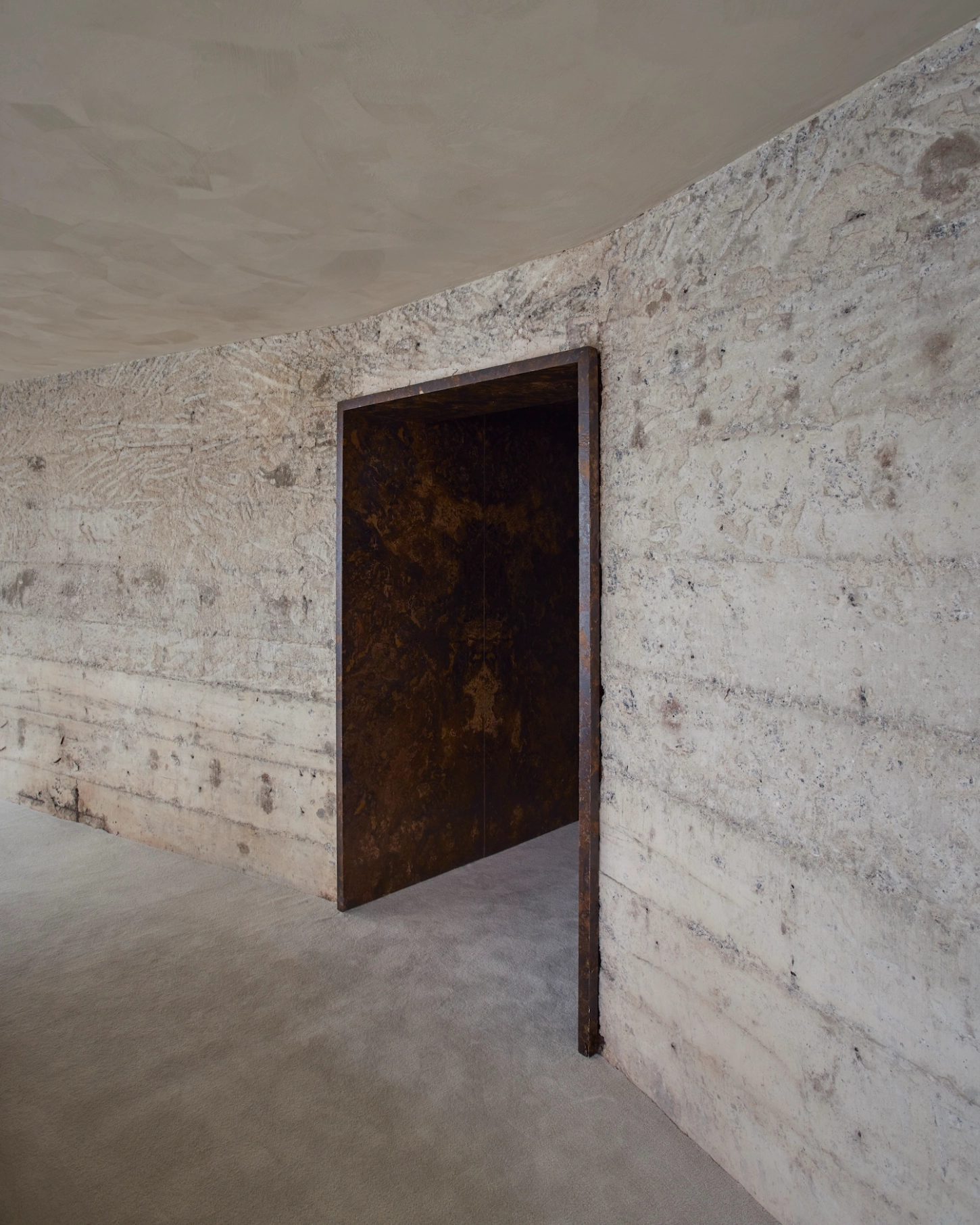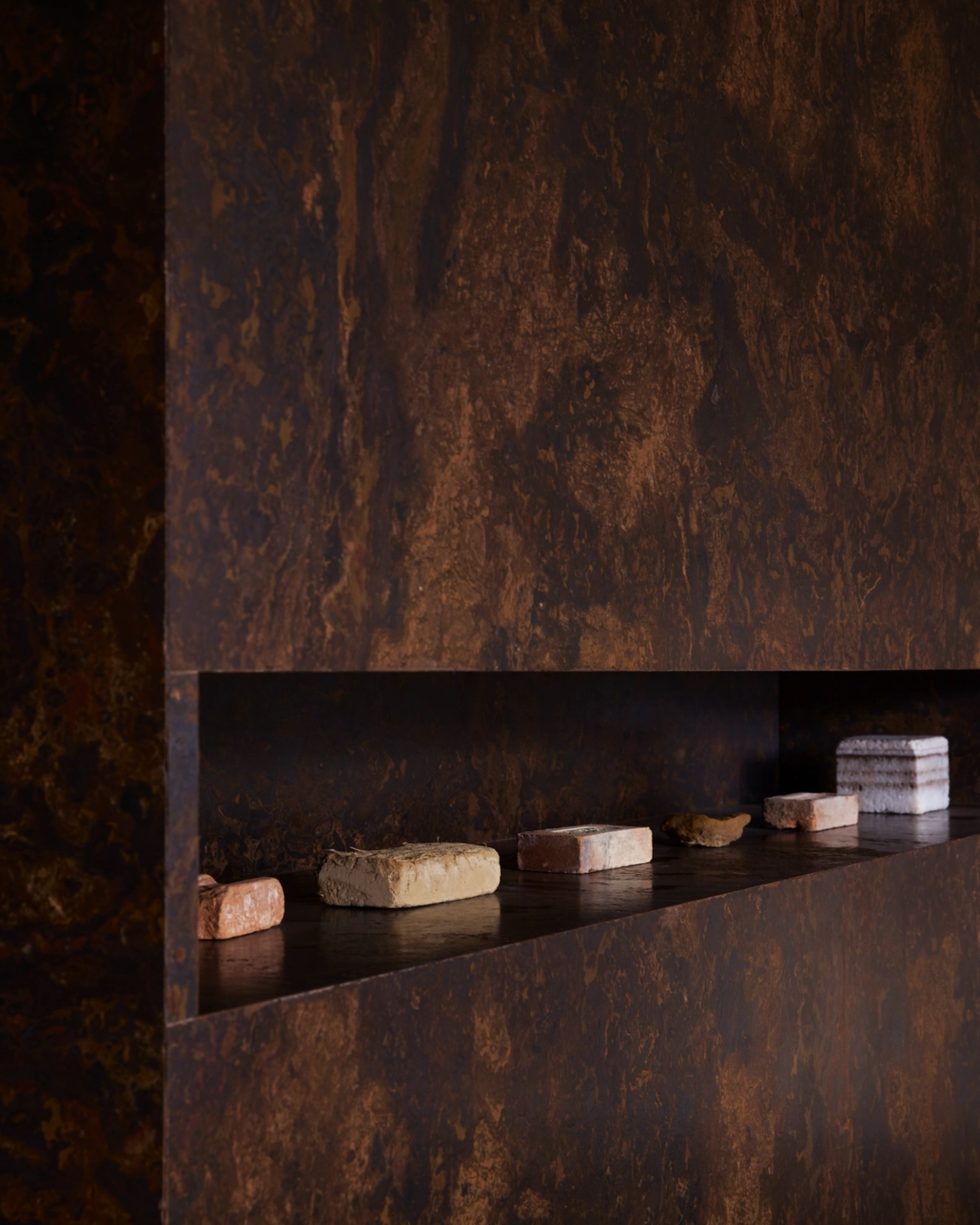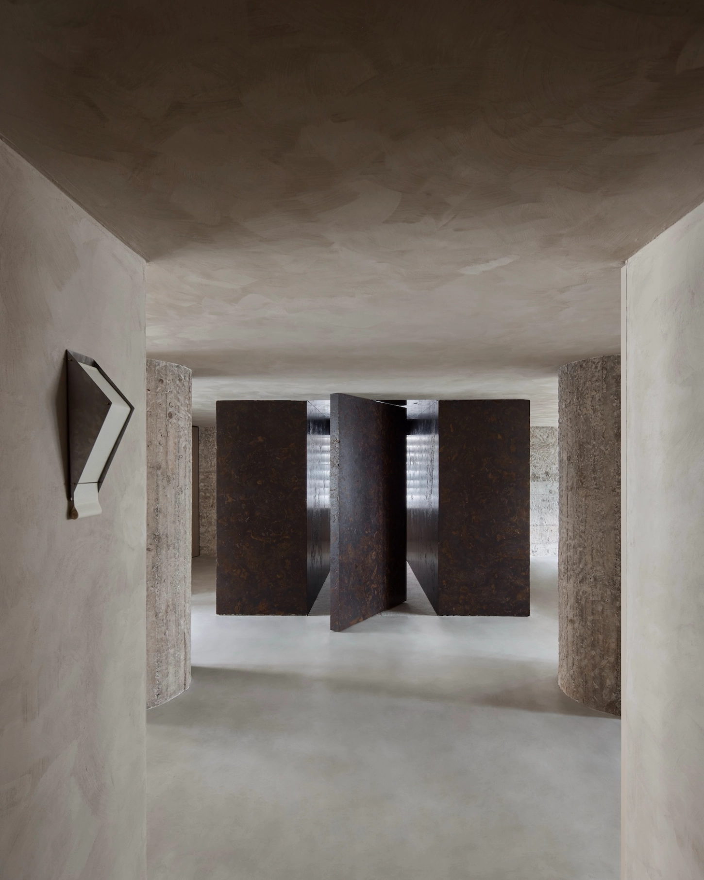 The existing concrete remains exposed, carrying visible traces of time and construction. This structural honesty establishes continuity with the building’s original modernist logic, allowing the new program to sit within a clear historical framework. Against this neutral base, volumes clad in Radica stone introduce density and define circulation. Their weight and texture contrast the concrete, grounding movement through the space and marking areas of more intimate occupation. Lime-coated walls and ceilings diffuse daylight evenly, producing soft luminosity without decorative additions.