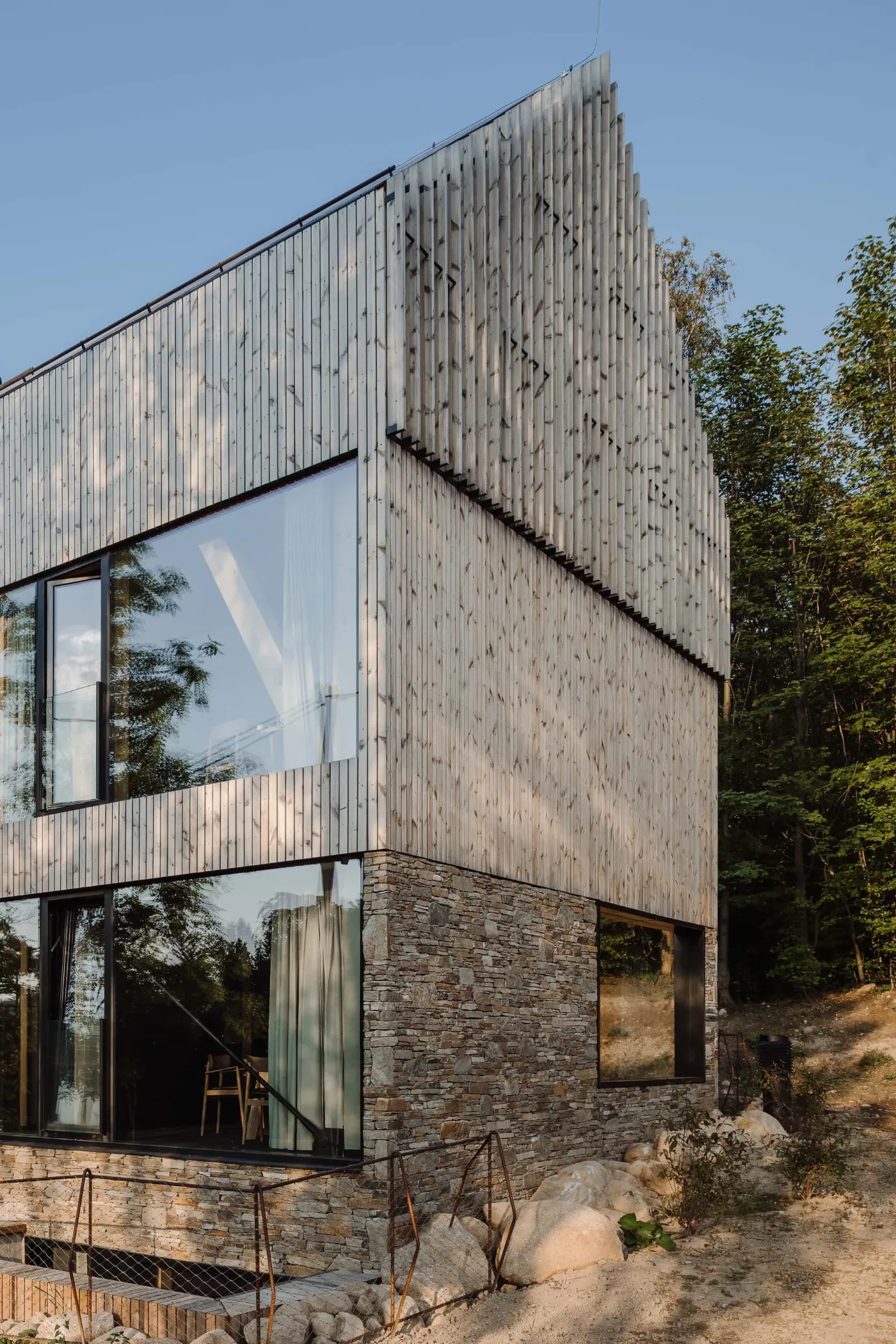 The concrete structure of the two lower floors is covered with split gneiss. Hand-formed piece by piece, the stones were carefully composed according to the character defined in the project. A solid stone plinth creates a massive base for a much lighter wooden frame on upper floors. Large format glazing exposes internal wooden structures resembling half-timbered type construction with its composition. The spectacular glazing of gable walls is covered with wooden vertical fins, a clear reference to the typical regional wooden gables. As a result of their natural beauty, the high-quality materials will grow old gracefully with time, and gradually, blend in with the surroundings of Karkonosze landscapes.