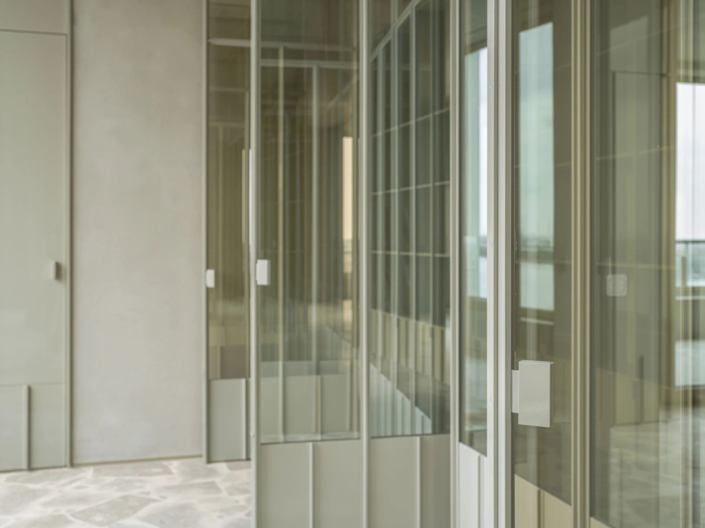 The first, and probably greatest, surprise is placed at the entrance of the apartment. Upon opening the front door, one is met with an immediate panoramic view over the city of Antwerp, due to a sizable floor-to-ceiling window right opposite the door. When you step inside the entrance, the sensory experience is even more intense: the 25 square meter foyer, except for the stone floor, is like a mirror box reflecting the city view endlessly.